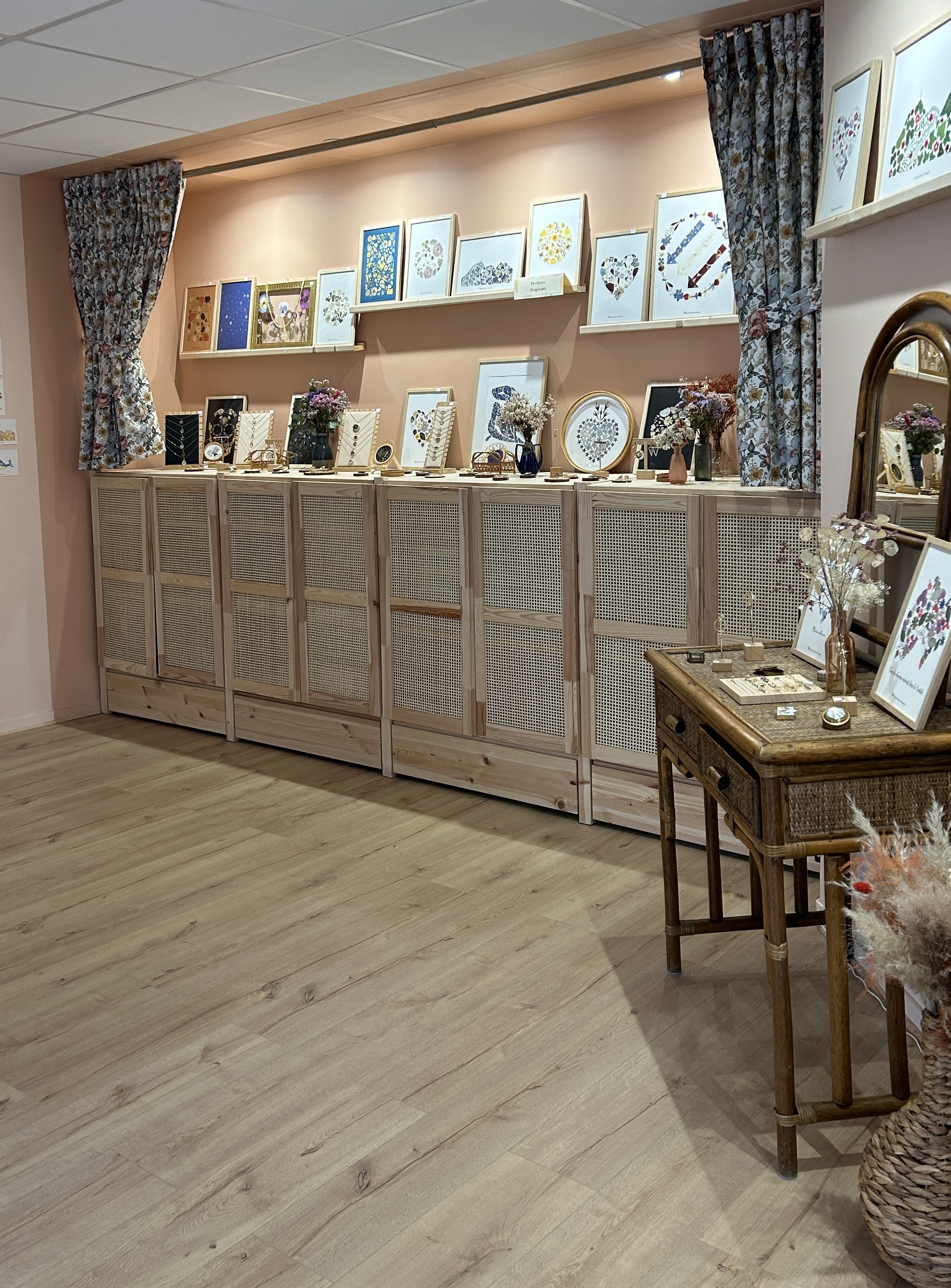 C'est également ici, dans cette ambiance cosy et chaleureuse, que nous organisons chaque trimestre nos ateliers herbiers. Venez partager un moment créatif et apprenez l'art délicat de composer avec la nature.